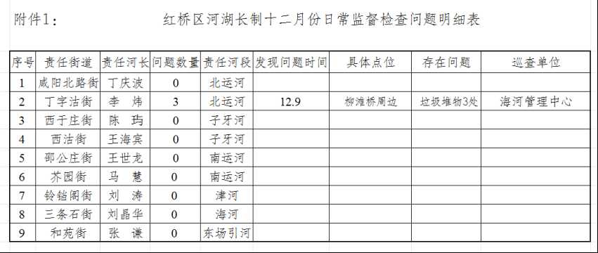 附件1:红桥区河湖长制十二月份日常监督检查问题明细表